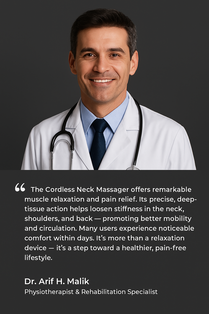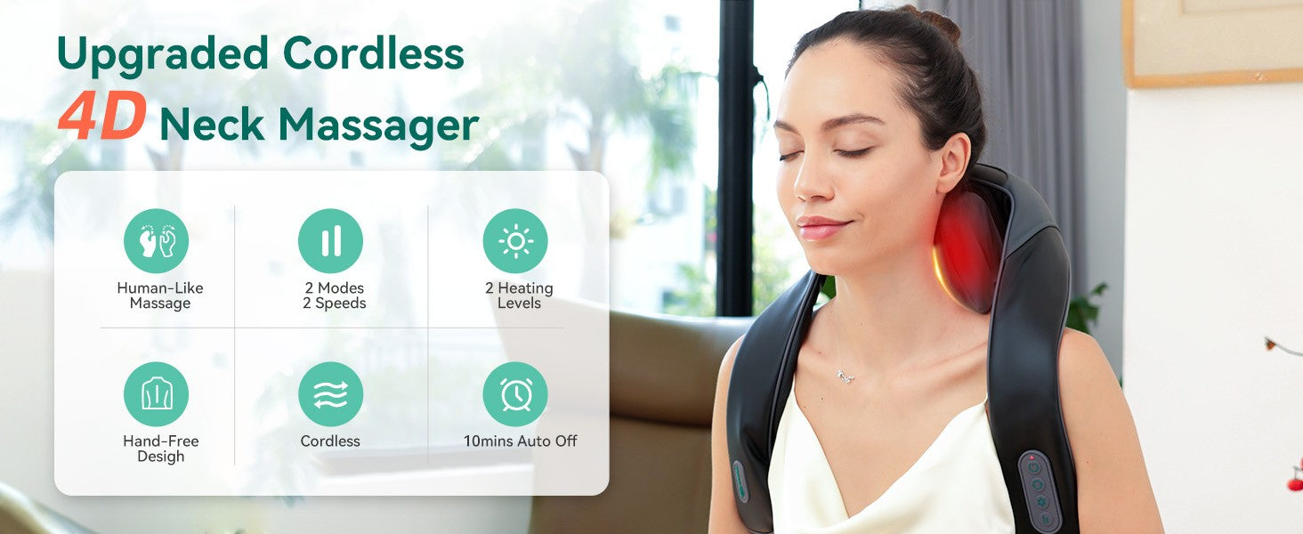 Experience full-body relaxation anytime, anywhere with the Cordless Neck Massager™ – Multi-Zone Relief System.